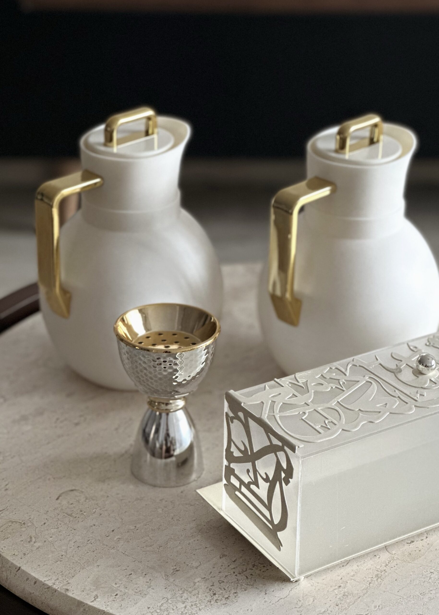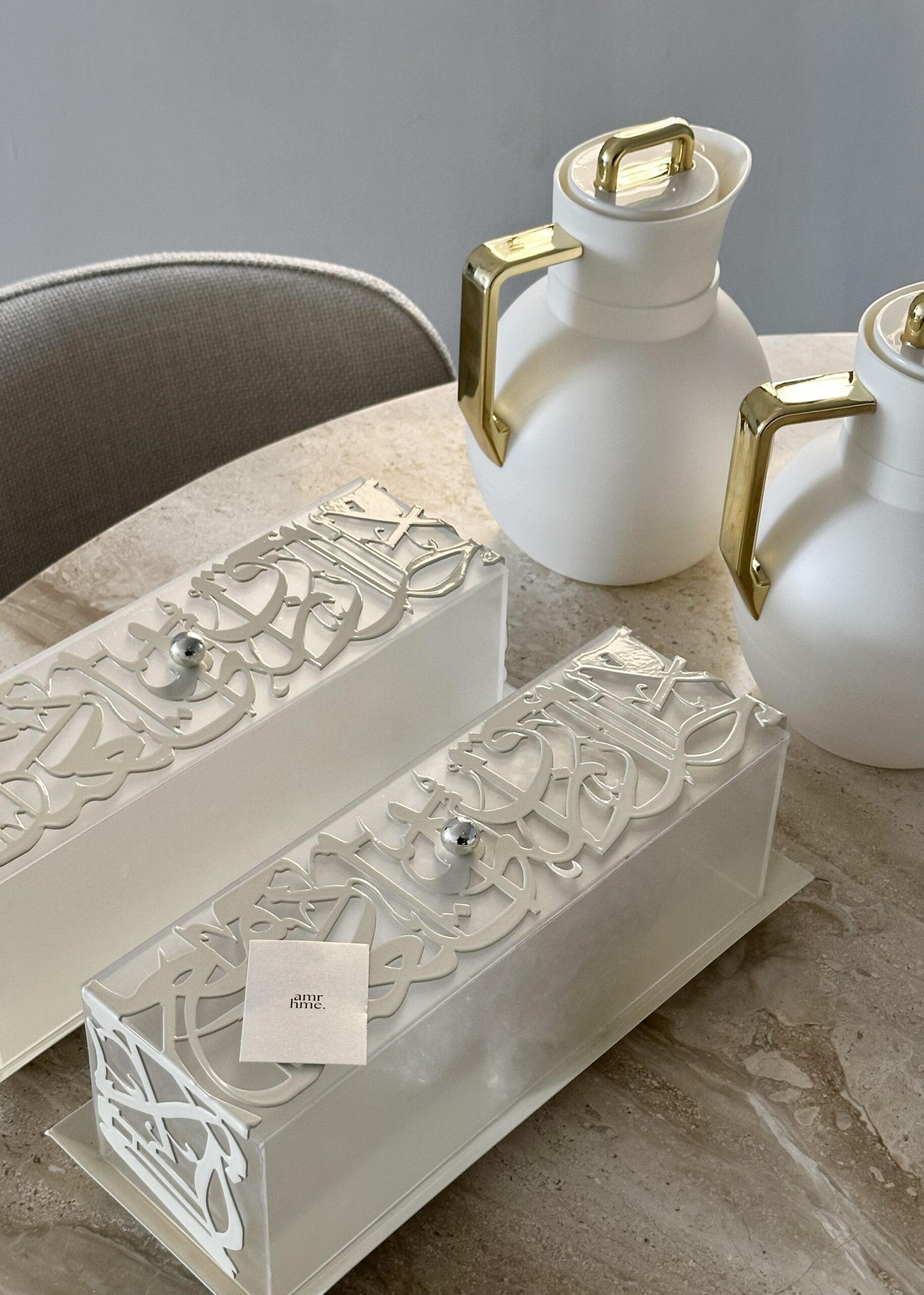 The Ayāt Tray brings together elegance and spirituality with its delicate Islamic calligraphy design. Crafted in a soft cream tone and finished with a matching lid, it is perfect for Ramadan gatherings and year-round hosting. Whether used for serving dates, sweets, drinks, or décor, this tray adds a touch of refinement and sacred beauty to any space.
